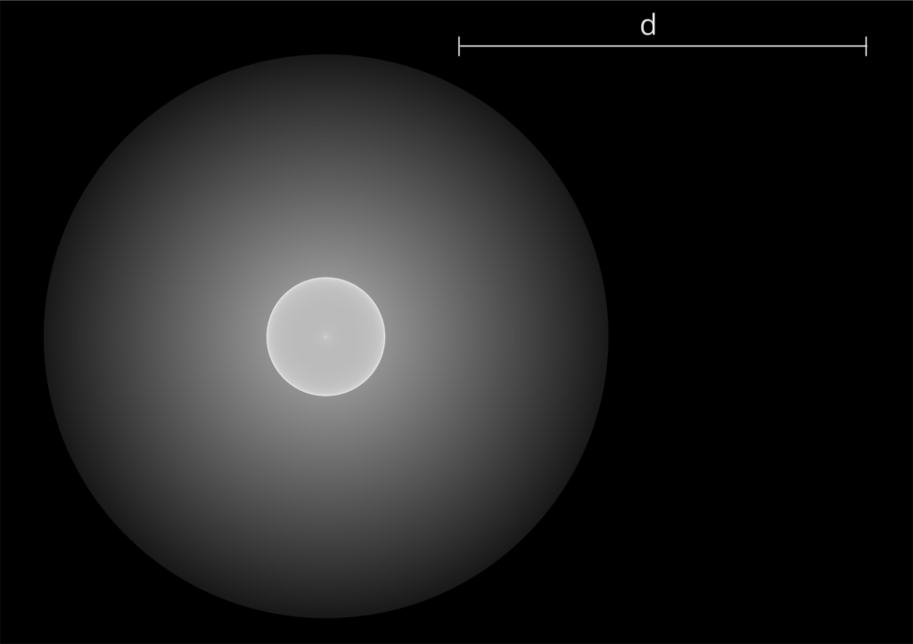 A crystal ball contains a tiny sphere of fluorescent dye adjacent to its inner surface. The ball is illuminated from behind with ultraviolet light, and as a result, the dye radiates visible light isotropically. The surface of the ball has an anti-reflection coating, so there are no partial reflections. However, there are microscopic impurities inside the ball that scatter light weakly. The figure shows the image seen on a screen placed in front of the ball; the length of the white line segment equals the diameter d of the ball. Find which fraction of the light energy emitted by the fluorescent dye departs the ball as scattered light. You may take length measurements from the figure. Neglect any light absorption inside the ball. You should aim to have two correct digits in your answer.